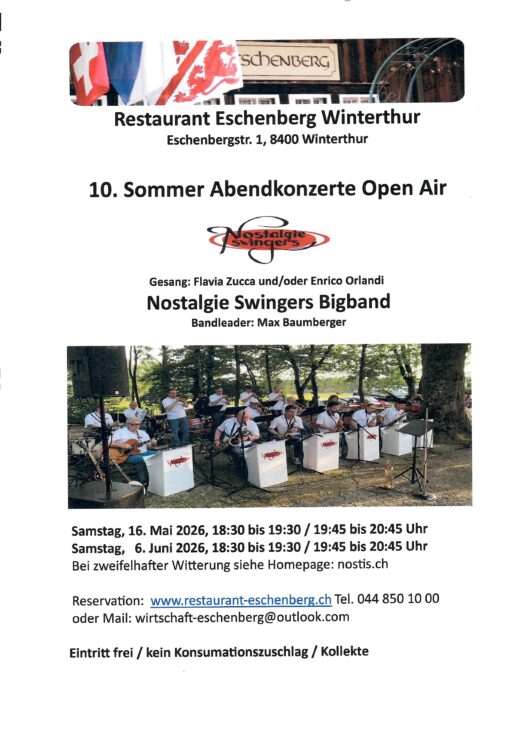 Wie in den vergangenen Jahren spielen wir wieder Sommer Abendkonzerte in den Monaten Mai und Juni auf dem Eschenberg. Wir spielen wieder an Samstag Abenden. Sie können ein ansprechendes, abwechslungsreiches Programm erwarten – tolle Instrumentalsongs mit Soli in verschiedenen Musikstilen. Voraussichtlich singen Flavia Zucca und/oder Enrico Orlandi internationale Swing- Pop und Rock Songs. Die Leitung und das Personal des Restaurants Eschenberg sowie die Nostalgie Swingers freuen sich auf Ihren Besuch
