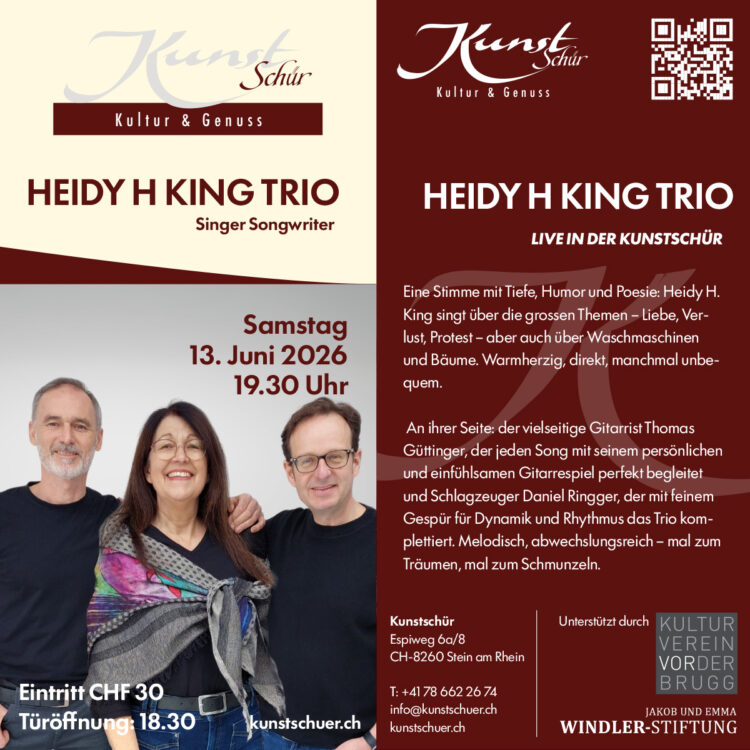 Eine Stimme mit Tiefe, Humor und Poesie: Heidy H King singt über die grossen Themen – Liebe, Verlust, Protest – aber auch über Waschmaschinen und Bäume. Warmherzig, direkt, manchmal unbequem.