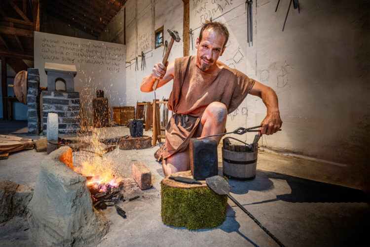 Jeweils am Samstag wird in der rekonstruierten römischen Schmiede im Legionärspfad Vindonissa eingefeuert. Besucherinnen und Besucher greifen zu Hammer und Zange und erleben zu zweit oder in der Gruppe (8 bis 12 Personen) authentisch das römische Schmiedehandwerk.