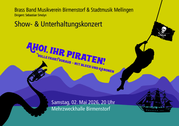 Der Musikverein Birmenstorf und die Stadtmusik Mellingen laden gemeinsam mit ihrem Dirigenten Sebastian Smolyn herzlich zum Show- und Unterhaltungskonzert ein. Freuen Sie sich auf einen abwechslungsreichen Konzertabend mit unterhaltsamer Rahmenhandlung und vielseitiger Brassmusik. Natürlich ist auch die Mini Brass mit am Start – ebenso wie die Tambouren, die das Programm zusätzlich bereichern.